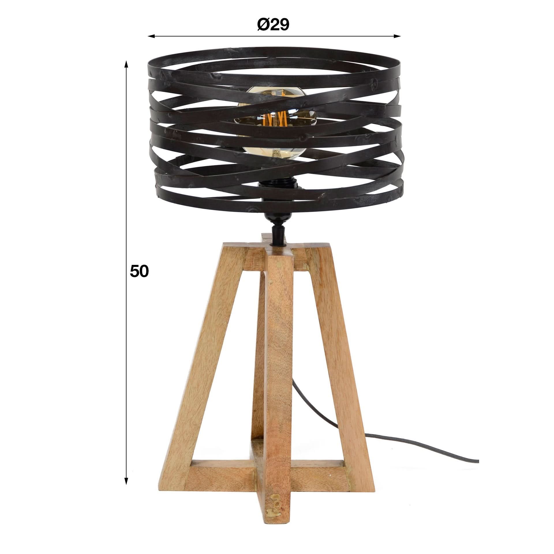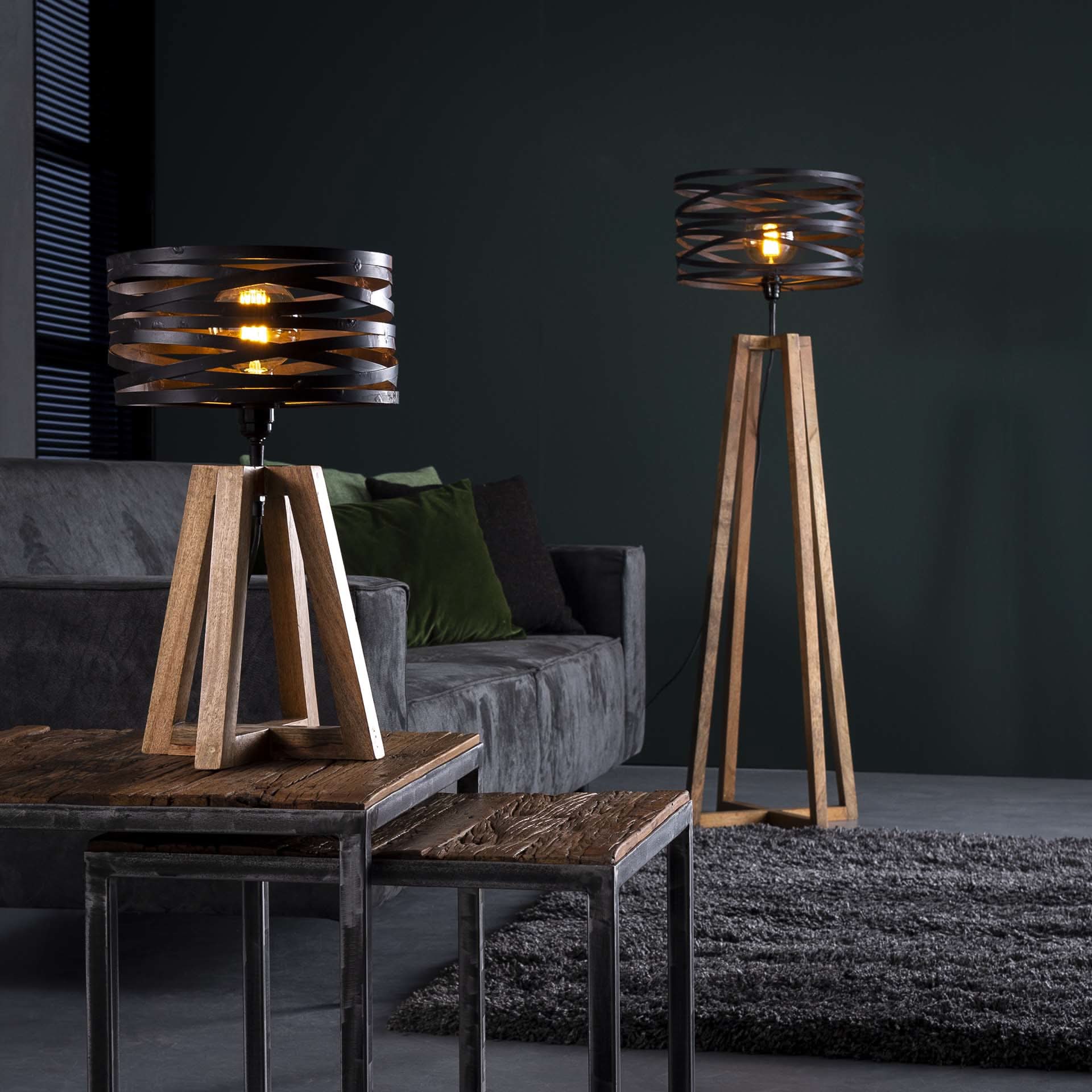 Diese trendige Tischleuchte hat einen gedrehten Metallschirm in Kombination mit einem gekreuzten Holzrahmen. Die Kapuze ist in Schiefergrau mit einem Hauch von Braun gehalten. Die Leuchte und der Schirm verleihen dieser Leuchte einen verspielten, zeitgemäßen Look. Es wird empfohlen, eine LED-Lichtquelle (8466) zu verwenden. Diese Tischleuchte ist Teil einer Serie bestehend aus einer Stehleuchte, einer Hängelampe und einer Tischleuchte.